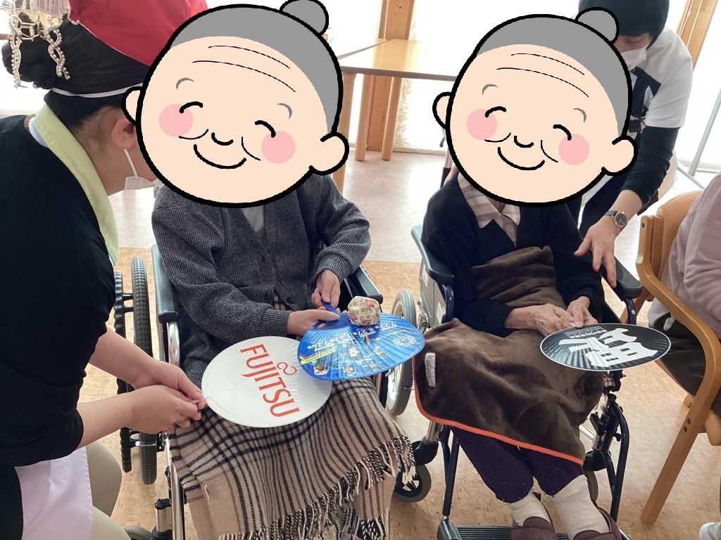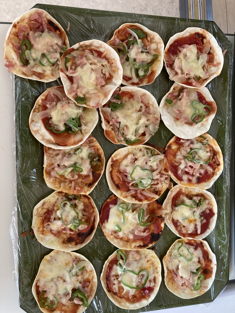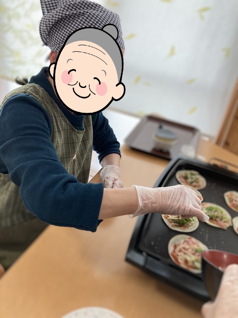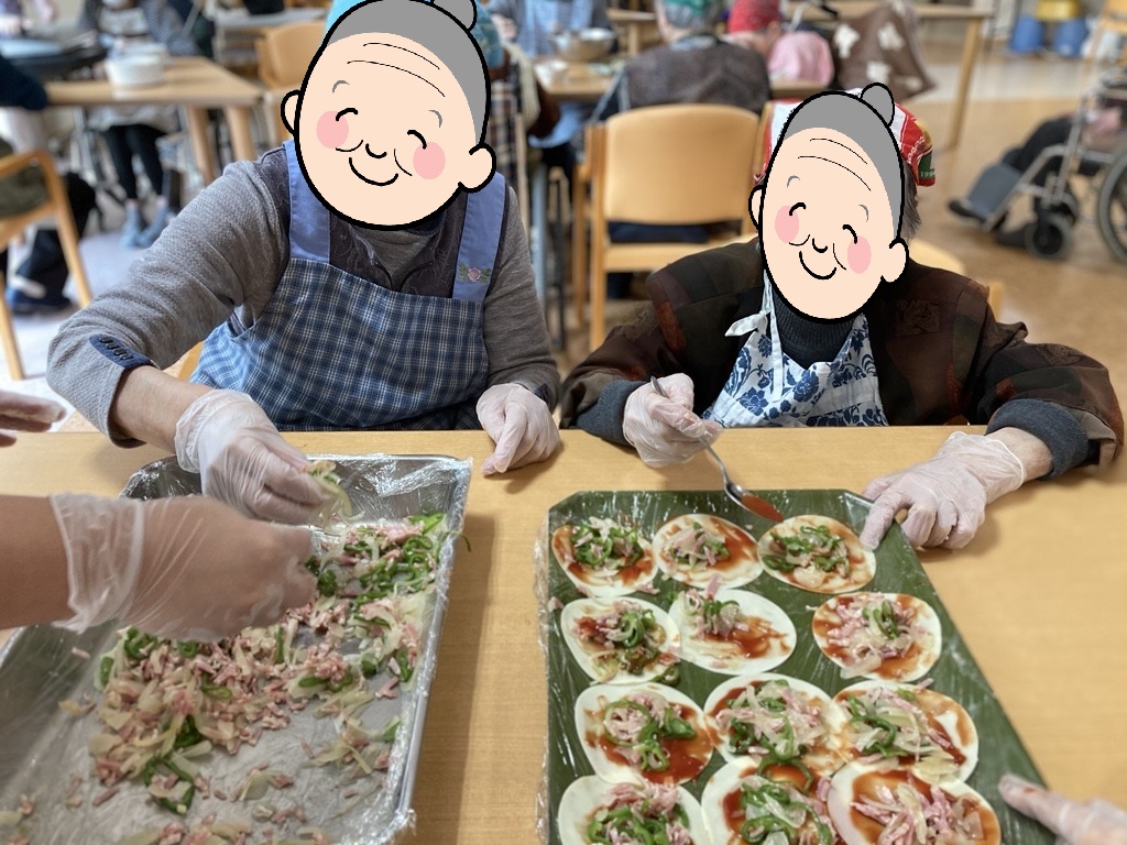 11月20日には、おやつレクでピザ作りを行いました。餃子の皮を使って具材やチーズでトッピングしてホットプレートで焼き上げ完成!!皮はパリパリしていて、チーズもとろ~り伸びてとてもおいしいピザが出来ました。