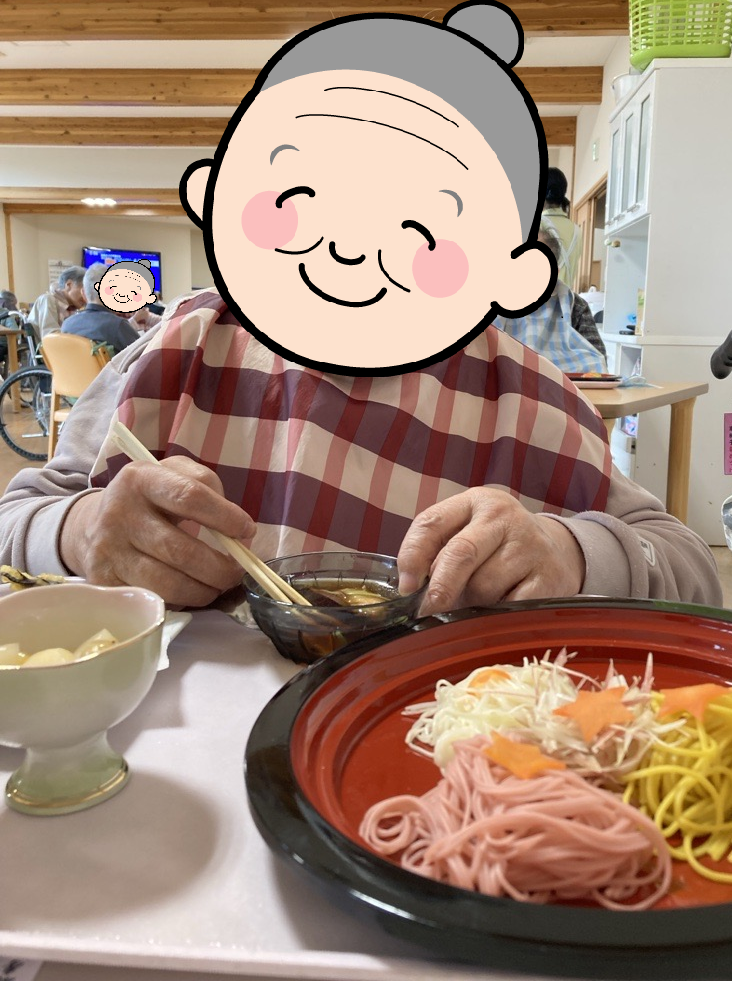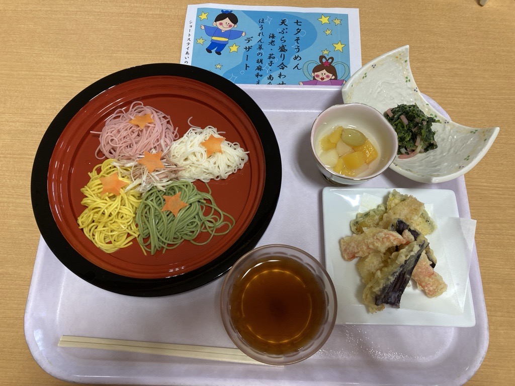 7月7日には、七夕祭りが行われました。お昼には4色のそうめんとサクサクの天ぷらを召し上がっていただき、おいしい!と好評でした。その後は、あいの森劇団による「かぐや姫」を鑑賞していただき、笑いあり涙ありで楽しんでいただきました。