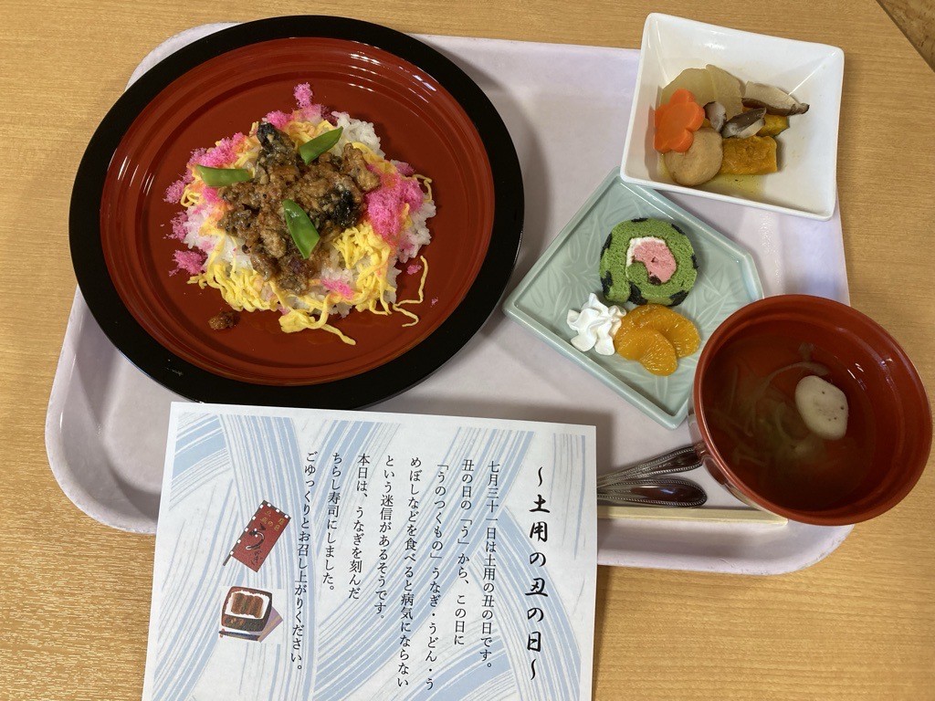 7月31日には、土用の丑の日ならではの鰻ちらし寿司を提供し召し上がっていただきました。華やかな盛り付けでとても好評でした!