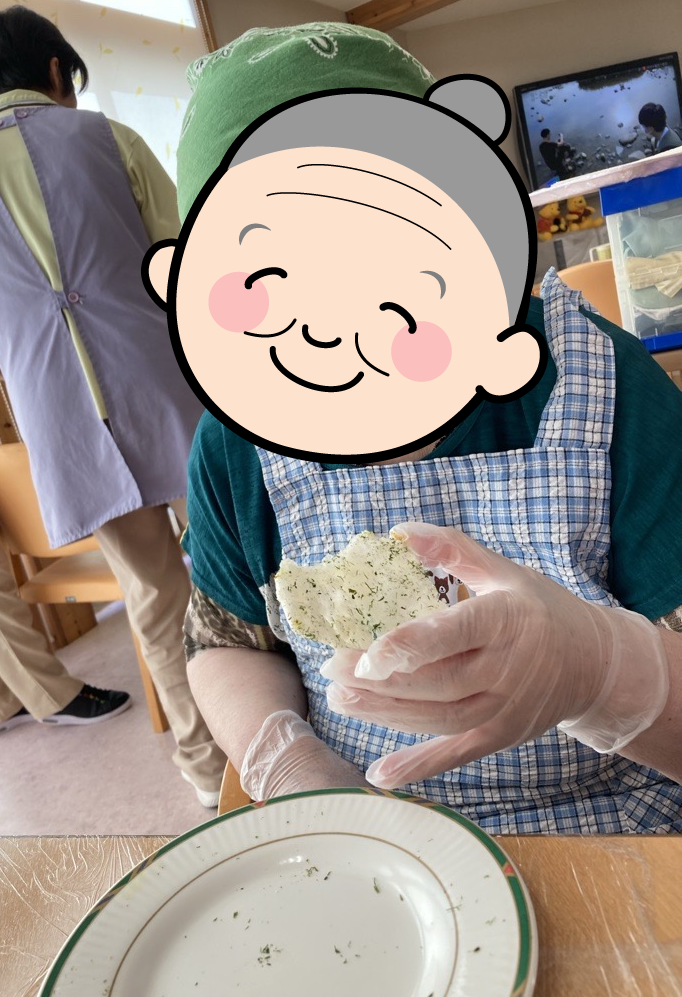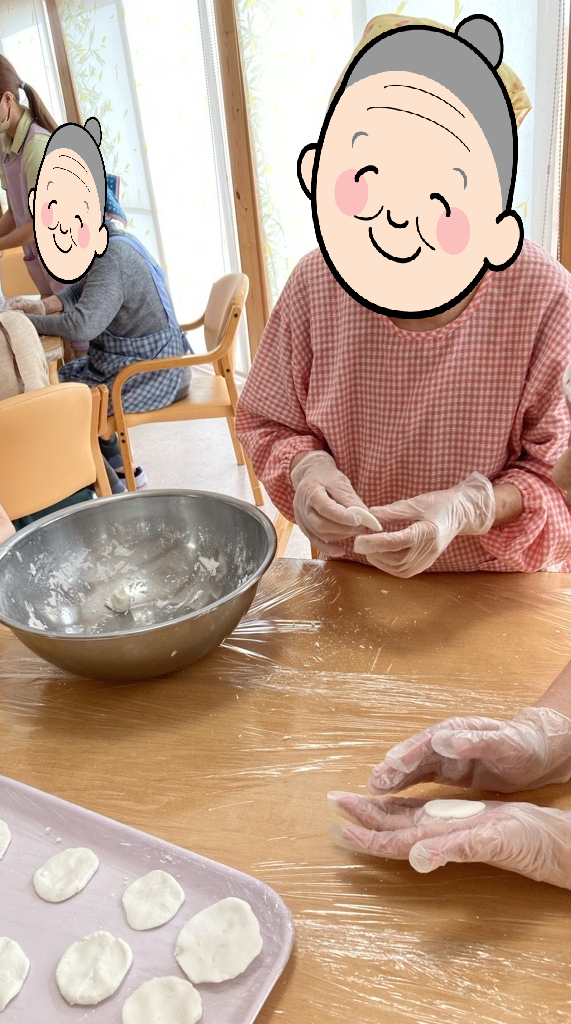 8月21日には、おやつレク 米粉せんべいを作りました。利用者様に米粉と水を混ぜて平らにしていただき、職員が揚げ焼きにしたものに海苔塩やカレー味をまぶし召し上がって頂きました。