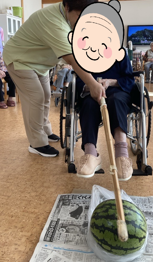 8月12日には、すいか割りを行いました。お互い声を掛け合いながらすいか割りを楽しんでいただき、おやつの時間に召し上がりました。