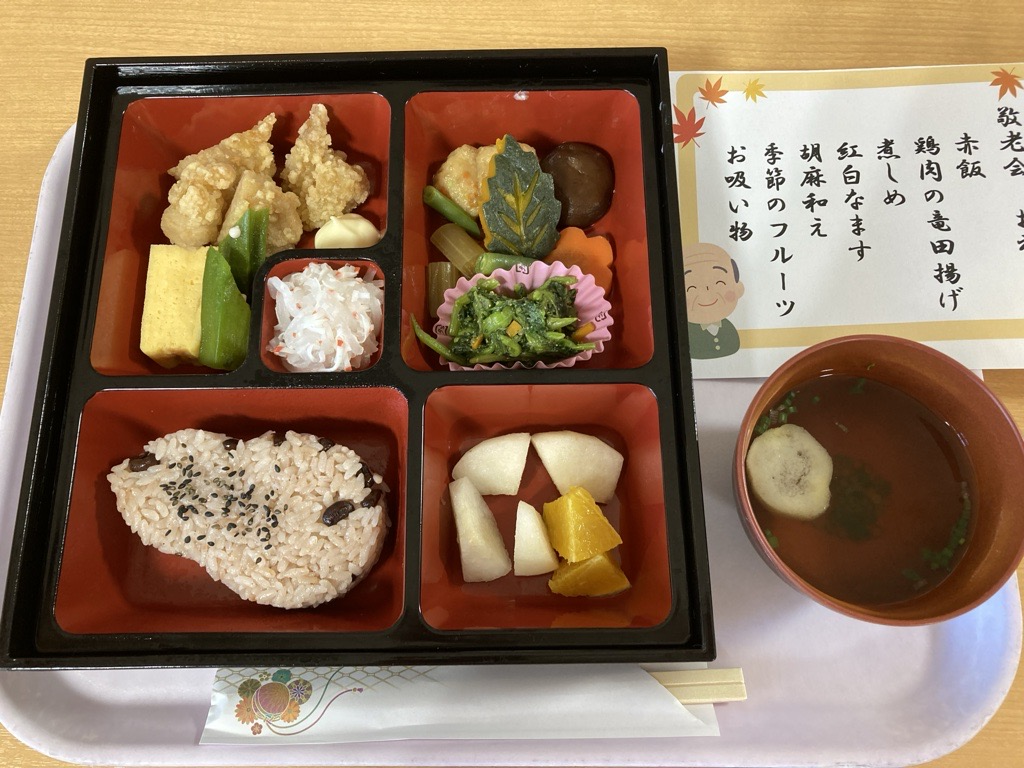 9月12日には、敬老会・慰問が行われました。秋田漫才の方々がいらして、手拍子をしながら一緒に歌を歌って楽しみました。お昼には敬老会弁当を召し上がりました。赤飯や紅白なますなど色とりどりのお弁当にとても好評でした!