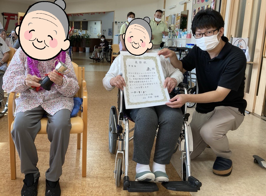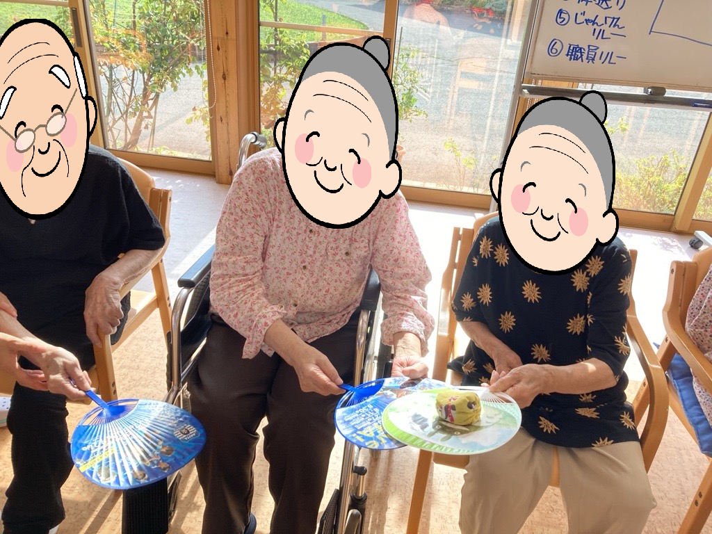 9月3日には、秋の大運動会が行われました。紅白チームに分かれ、じゃんけんリレー・玉入れ・輪投げ・うちわを使ったお手玉送りなどを行い競いました。皆さん、お互い声をかけながら楽しむことができました!優勝した赤チームにはトロフィーが授与されました。