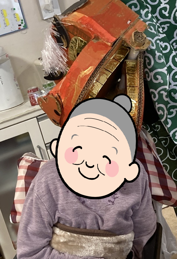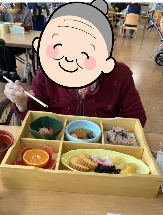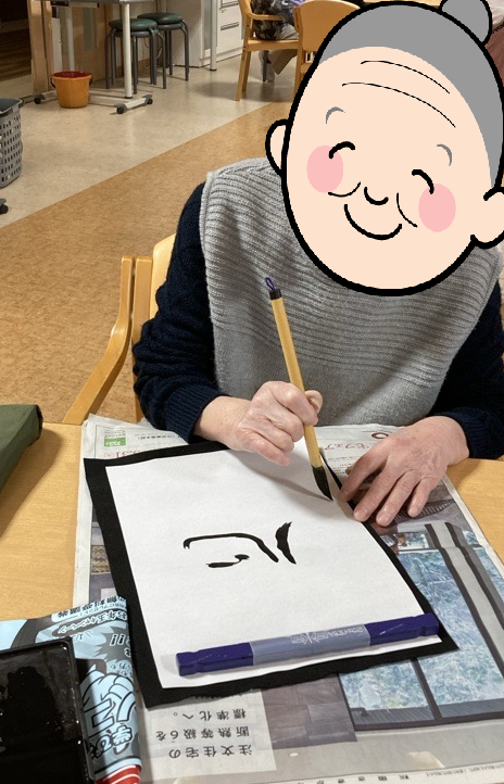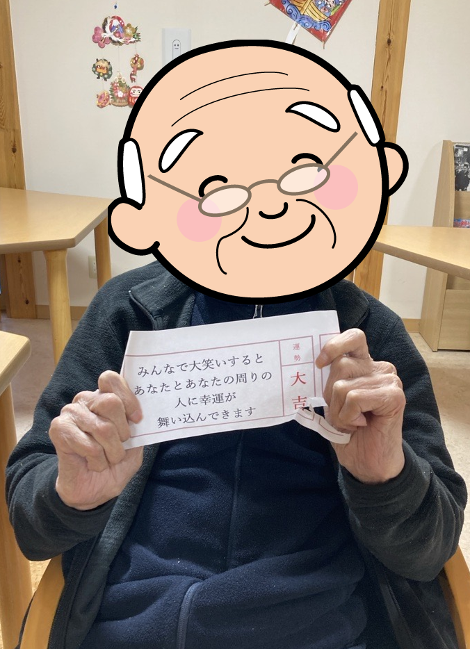 1月5~7日の期間は新年会を行いました。お昼にはお正月膳を召し上がっていただきました。午後からおみくじ・書初め・二人羽織などを行いお正月を楽しみました。ご利用者様と職員が協力し合いとても楽しいひと時でした♬書初めは施設内に掲示してあります。獅子舞も登場し、ご利用者様の頭を噛んでいただき、疫病退散していただきました!