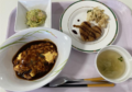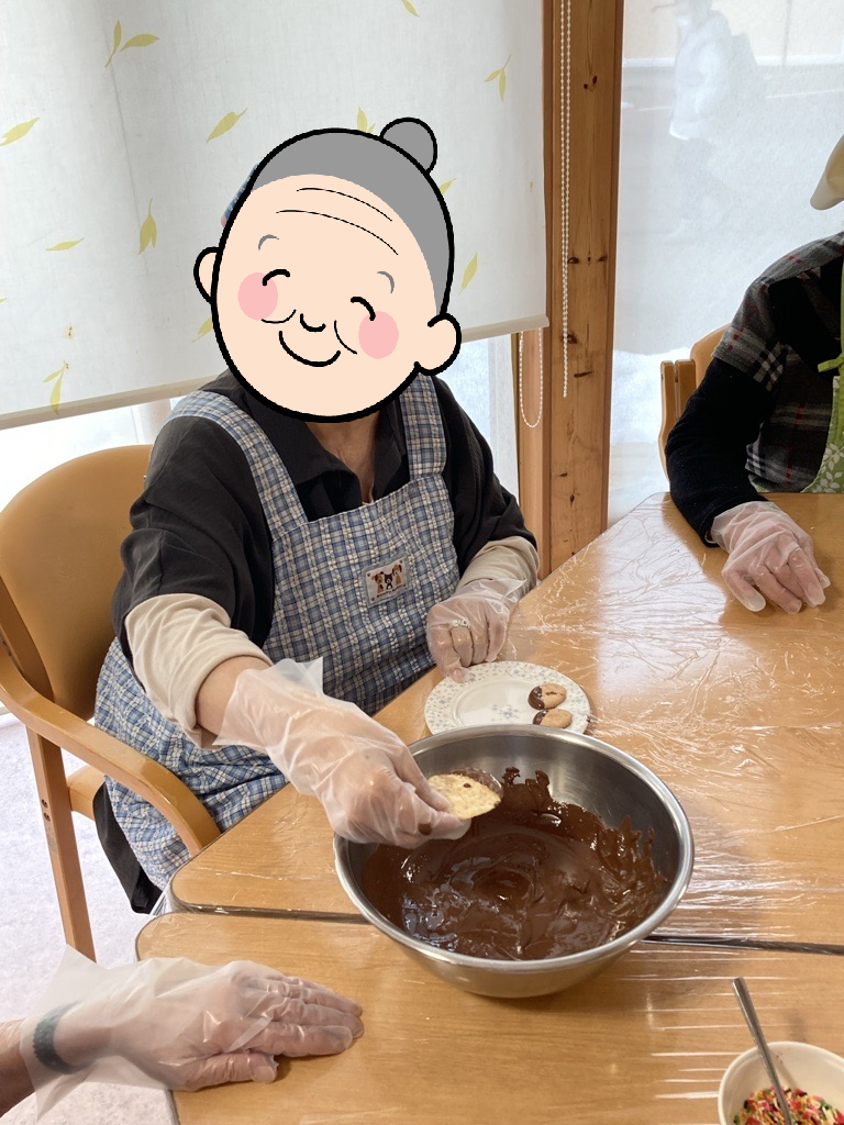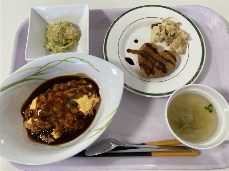 2月13日には、おやつレク(チョコっと)が行われました。プレッツェルとせんべいに溶かしたチョコをつけて頂き、皆さんに提供されました。あまじょっぱさが癖になり好評でした。次の日には、バレンタインメニュー、デミグラスオムライスとハート型のコロッケが提供され召し上がりました。