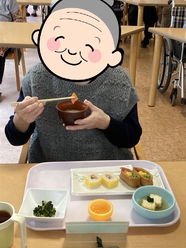 2月3日には、節分行事を行いました。お昼にはちらしいなりが提供され、見た目も華やかで喜ばれていました!午後からは、鬼が登場し、皆さんで声を出して「鬼は外!福は内!!」と元気に豆まきを行いました。皆様の健康を願いました。