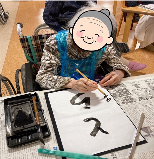 年明けには正月行事として書初めや二人羽織を行いました。皆さんが上手に書いた書初めは施設内に掲示しております!感染対策を行いながら来月も様々な行事を実施したいと思います。