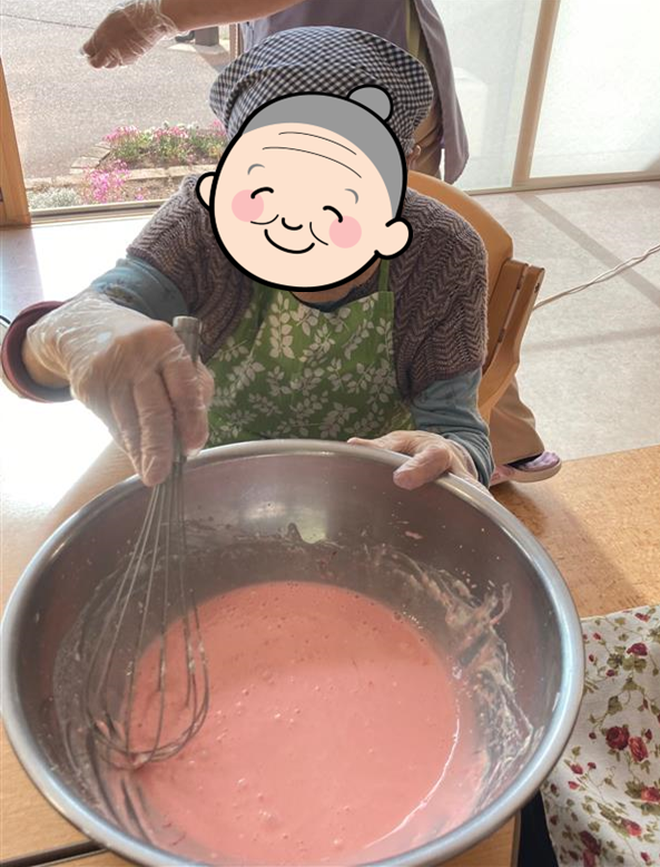 4月11日はおやつレクでさくら餅を作りました。生地を混ぜ、ホットプレートで生地を焼く作業も