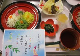 あいの森では7月7日に七夕の行事食を提供しました。 赤・緑・黄・白のそうめんと天ぷらの盛り合わせは彩りがよく、 味もとてもおいしいとのお声を頂くことができました。 7月13日はバナナクレープづくりを行いました。 生地を薄く焼くのは難しかったですが、 ...